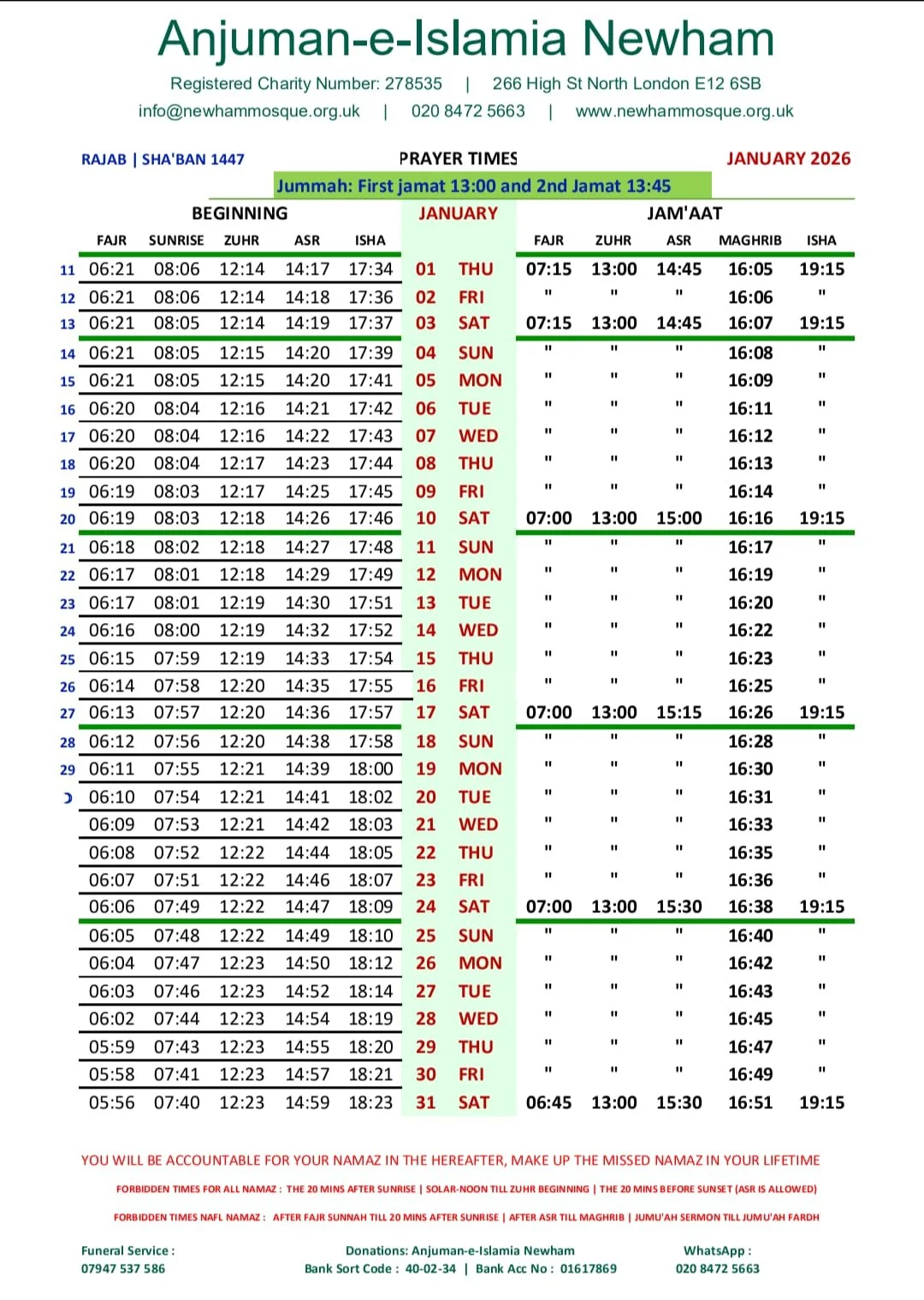 Prayer times ANJUMAN -E- ISLAMIA NEWHAM